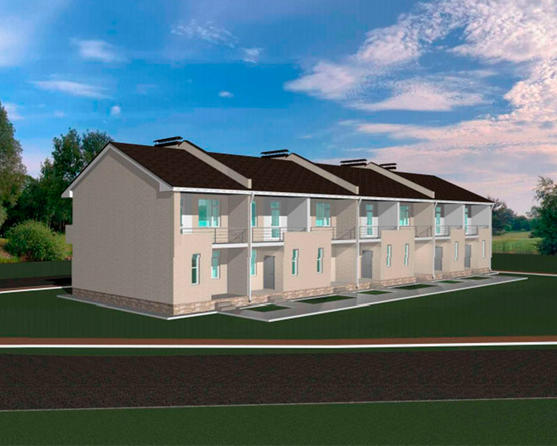 В каждой квартире предусмотрен просторный балкон, на котором можно будет разместить шезлонги для отдыха или поставить столик. На первом этаже квартиры располагаются гостиная и кухня. Комнаты разделены дверью, так что гостиная может выполнять роль гостевой спальни при необходимости. На кухне легко помещаются гарнитур и столовая зона. Каждая квартира рассчитана на 2 спальни на втором этаже: хозяйскую и детскую. Само здание имеет продолговатую форму прямоугольника, так что вы можете разместить его на вытянутом участке.