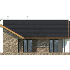 Дом рассчитан на семью с детьми, также одну спальню при желании можно превратить в кабинет. Фасад дома красиво декорирован диким камнем, что придает ему особую изюминку. Такой дом будет выигрышно смотреться и в черте города, и в коттеджном поселке.